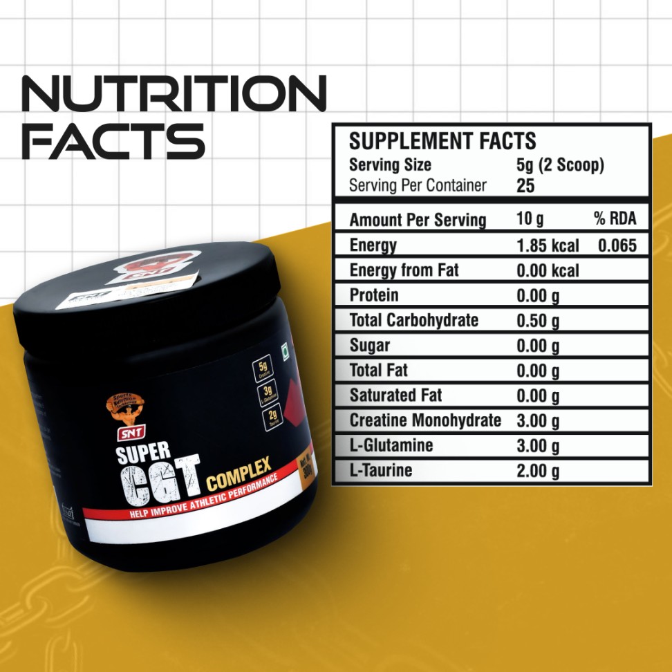 SNT SUPER CGT Complex is an outstanding amino acid based supplement for aspiring body builders looking for not just high power stamina but speedy recovery from the obvious wear and tear they come across during their training or workout session. The advanced formula developed and executed by the SNT nutrition experts ensures creatine monohydrate, L – Glutamine and Taurine providing endurance in abundance through its pure ingredients processed into SNT Super CGT Complex. In addition to creatine’s role in ATP energy production, it may also improve the function of your muscle cells in other ways.